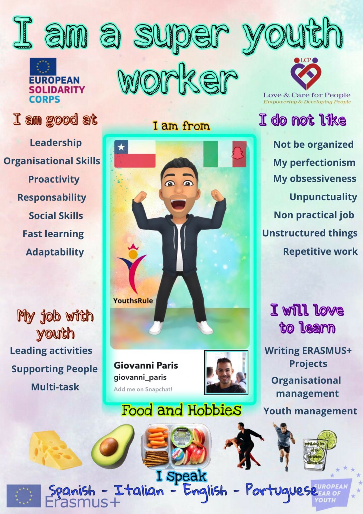 I am Giovanni Paris, 31 years old and I was born in Chile. I am a very responsible professional with great motivation to live different work experiences. I am a sociable, empathetic, and proactive person with a great vocation for assistance. Thanks to my studies (Physical therapy and Psychology) and my intercultural experiences in Chile, Italy, and Spain I feel prepared to work efficiently with the youngsters of LCP. I like challenges and I feel the need to keep learning from new experiences.