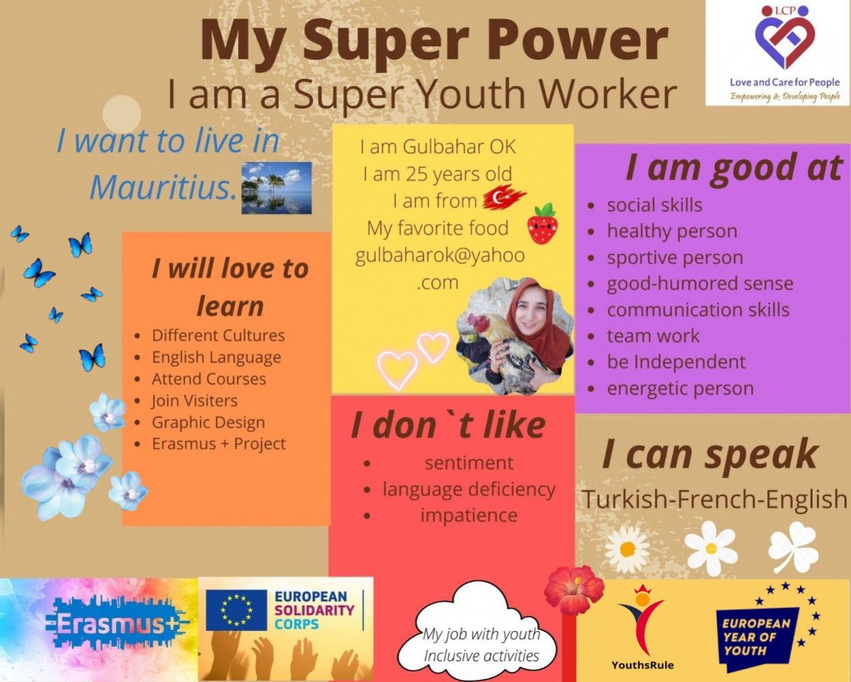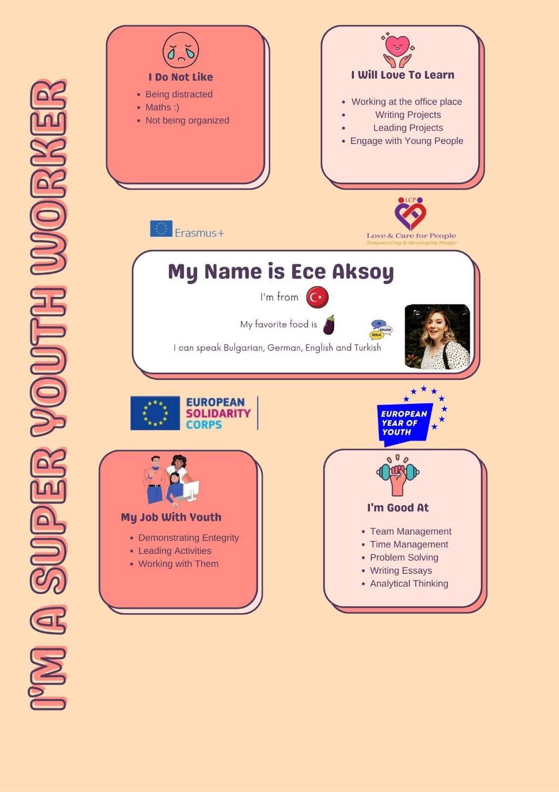 Hello Everyone! My name is Ece Aksoy. I´m from Turkey. I'm 21 years old. I`m studying English Language and Literature. Now, I`m a youthworker at Love and Care for People.