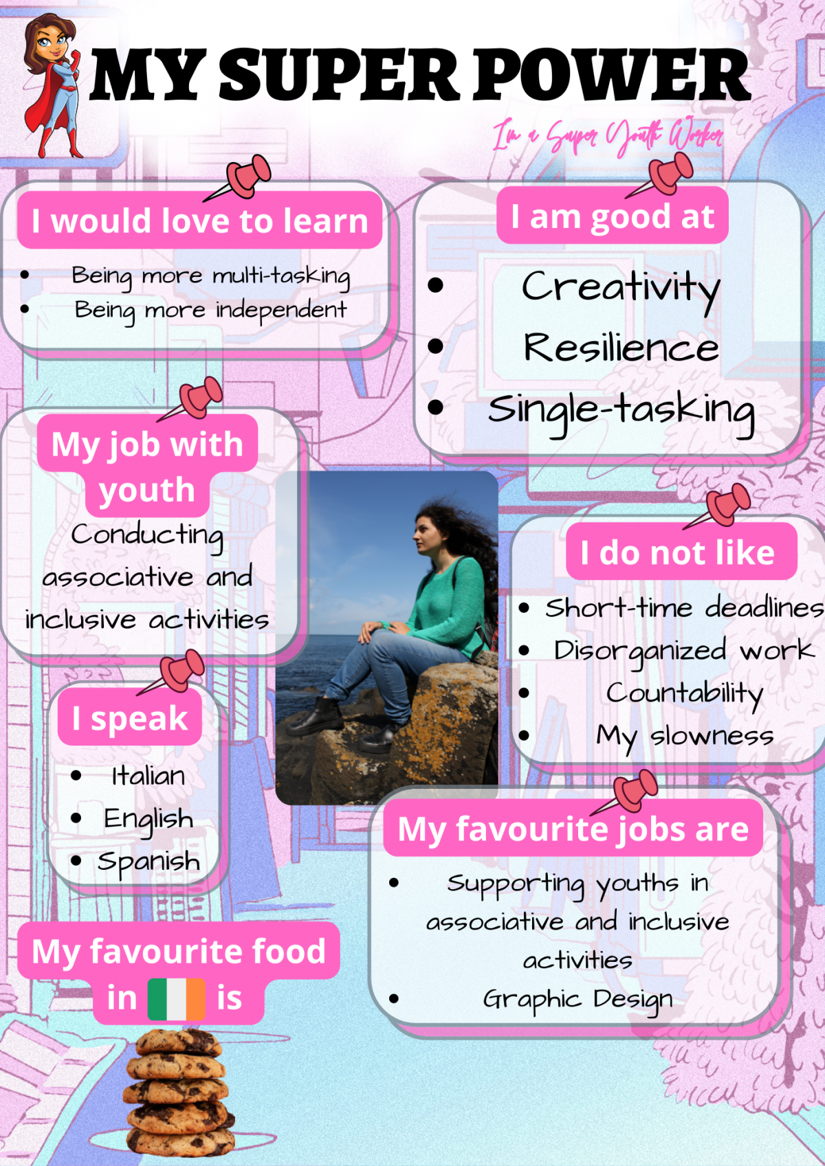 I hope to continue learning and developing skills related to Youth Work. In the future I would like to work with young people by linkening my studies in Physical Therapy and Psychology.